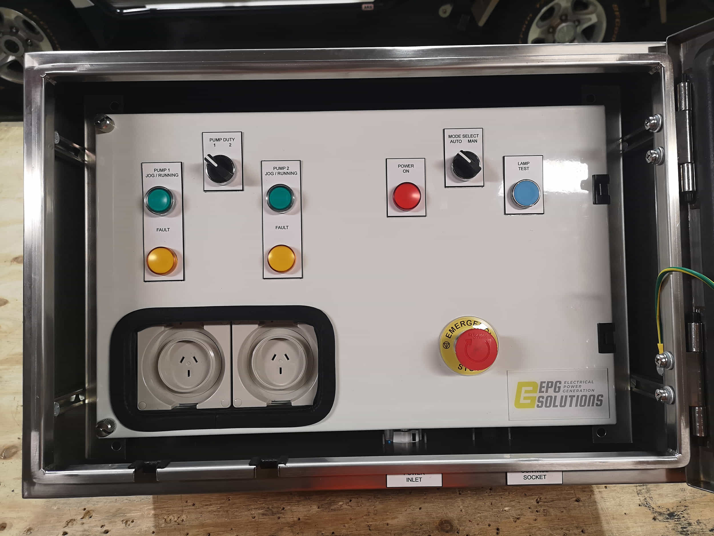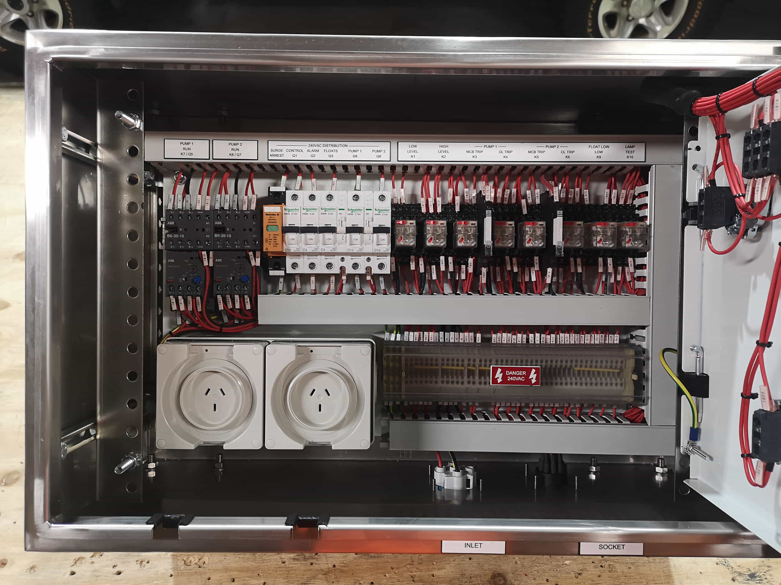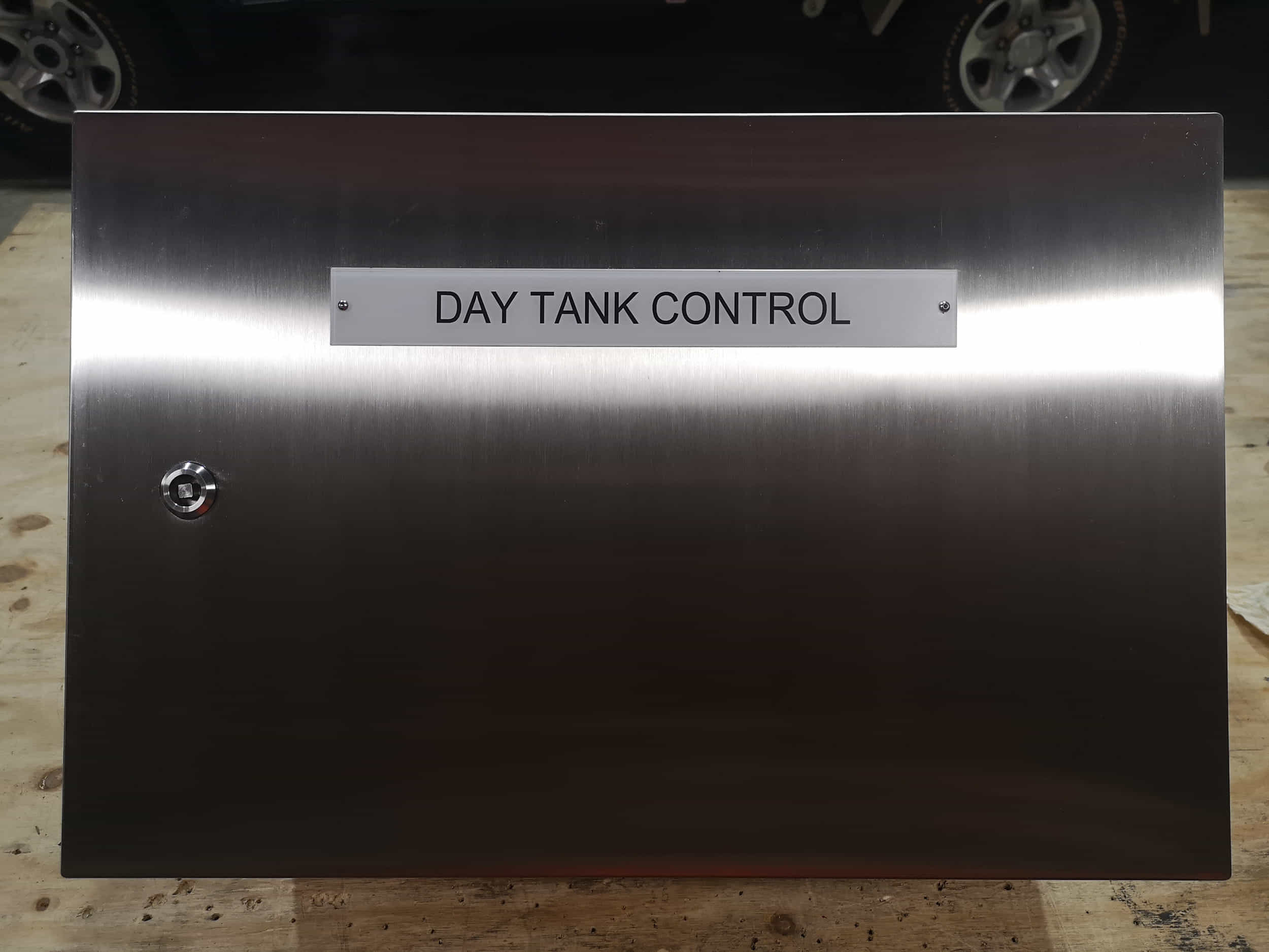 The DT240 and DT240e are our own designs and are a 240V control system. This system regulates the pumps that transfer fuel from the bulk tanks to the day tank. If the duty selected pump fails, the secondary pump is automatically started, and an alarm and strobe light alert are set off to advise staff on-site of the fault. This can also be incorporated into the station SCADA which allows for remote monitoring.